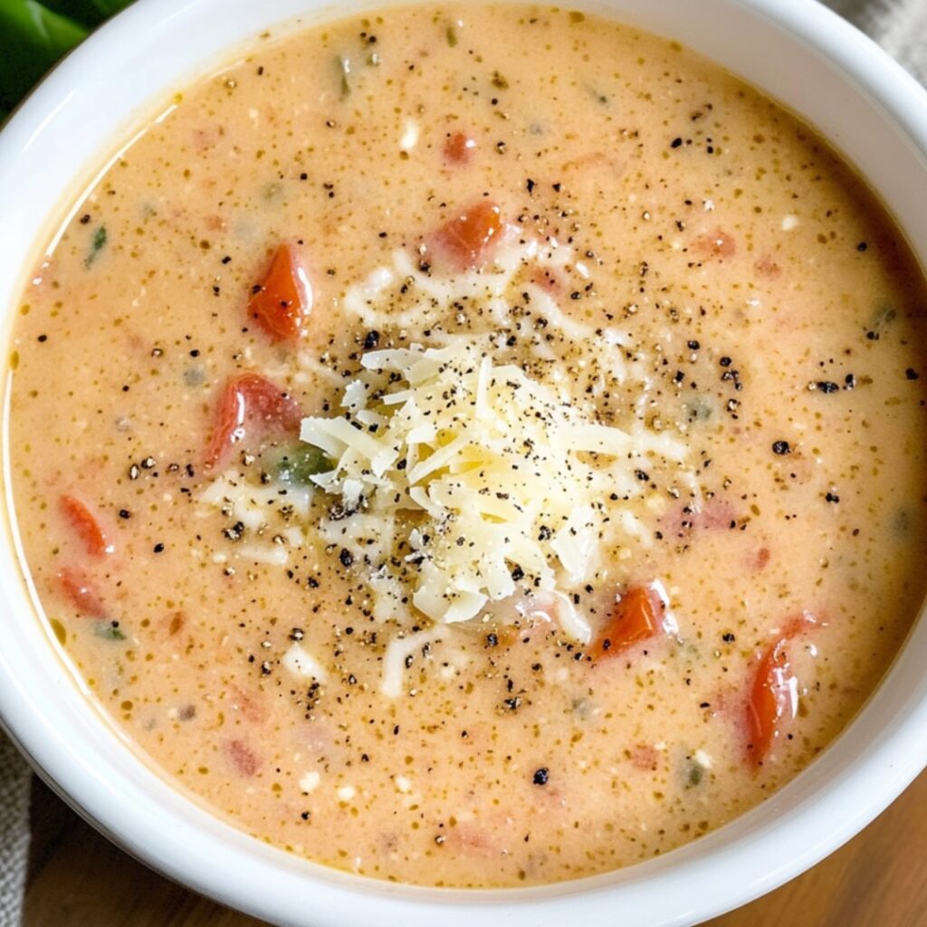 Creamy tomato basil Parmesan soup in a bowl topped with fresh basil
