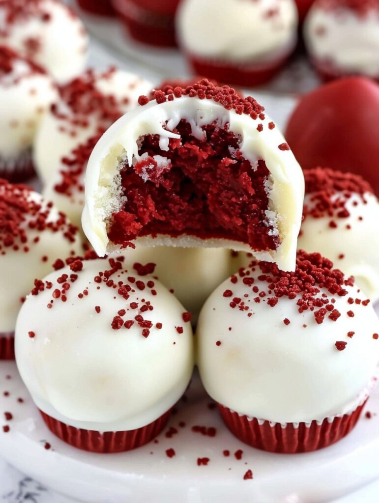 Red Velvet Snowball Truffles coated in white chocolate and powdered sugar