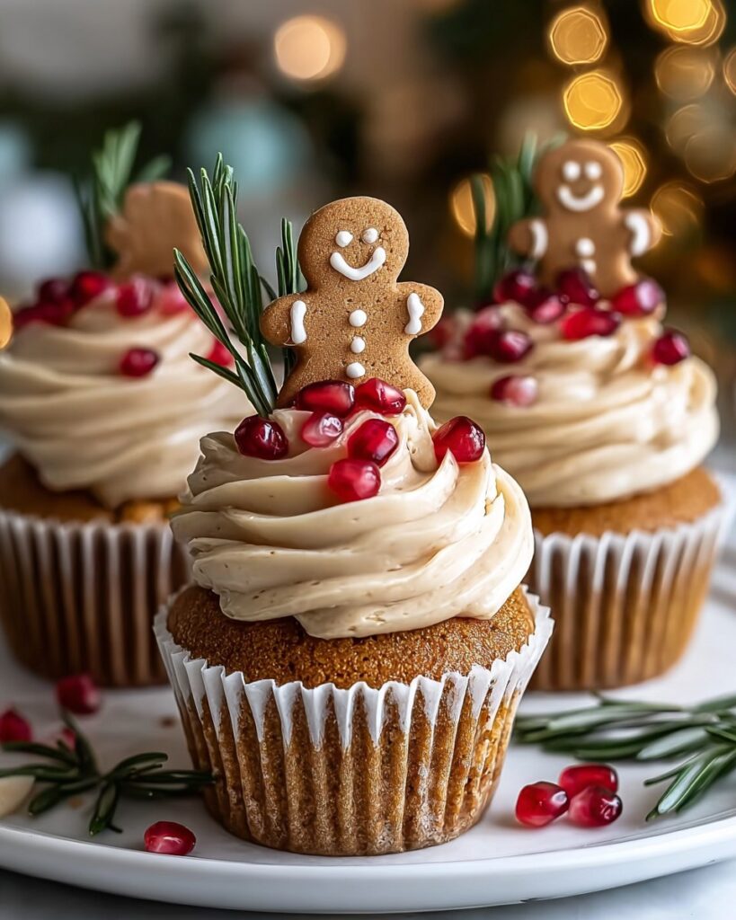 Gingerbread cupcakes topped with cinnamon frosting and holiday sprinkles