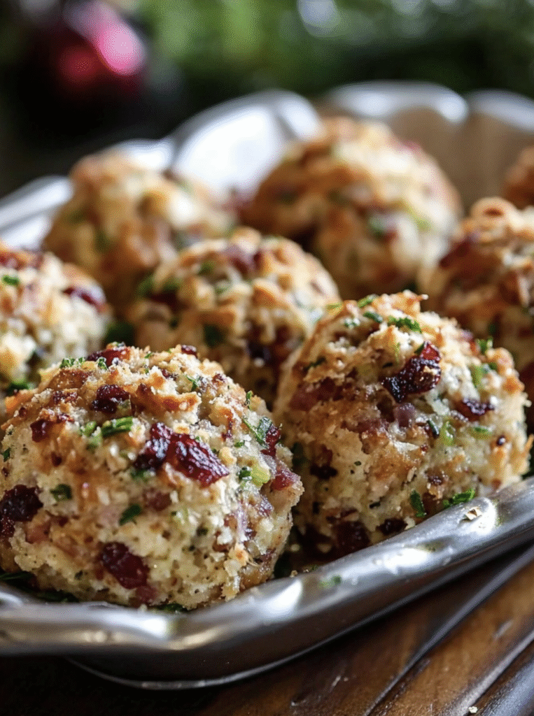 Golden cranberry turkey stuffing balls with bacon and Parmesan on festive plate