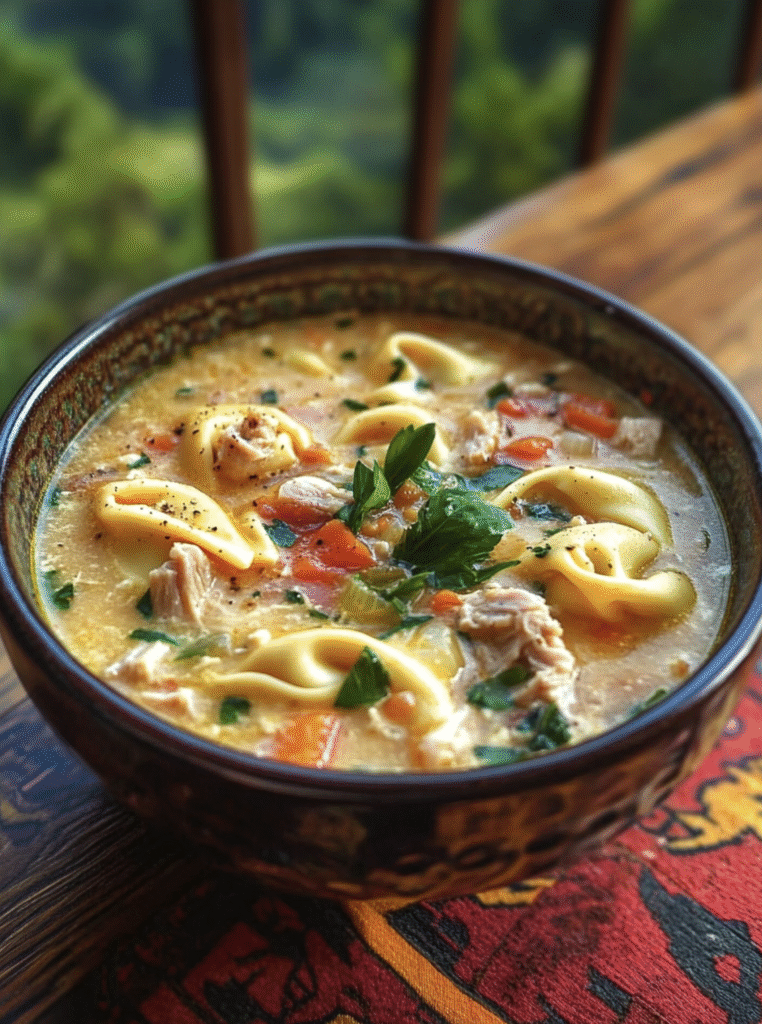 Bowl of creamy smoked turkey tortellini soup with spinach and Parmesan garnish