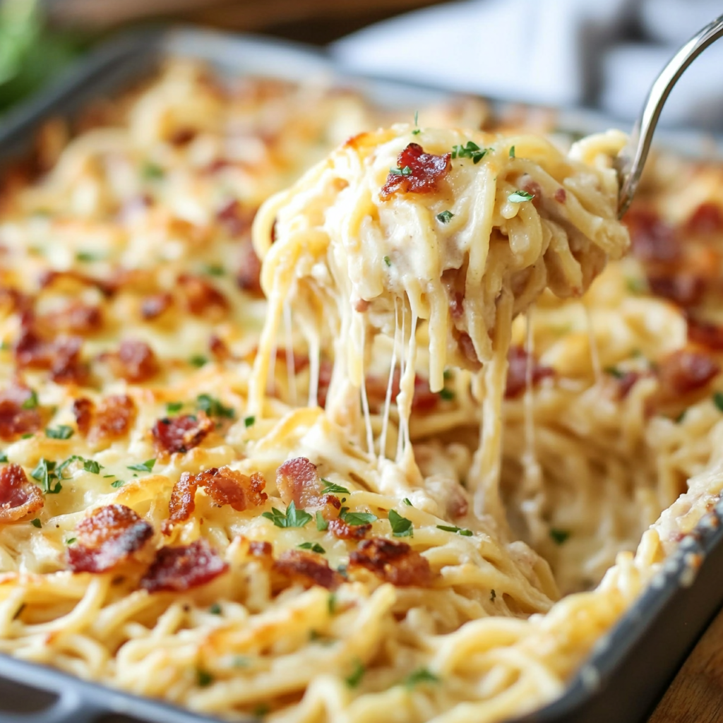 Unlike traditional spaghetti, this baked version takes it up a notch with smoky bacon and a rich, creamy texture that clings to every noodle. It’s simple to make, requires basic ingredients, and feeds a crowd with ease — everything you want in a comforting pasta bake.