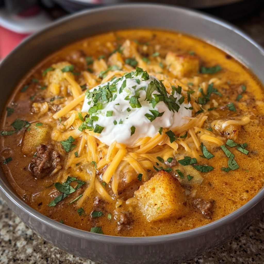 This soup blends the best parts of potato soup with the fun flavors of a cheesy taco. The crockpot slowly softens the potatoes and infuses the broth with spices, beef, and Rotel tomatoes. The finishing touch — cheddar cheese, heavy cream, sour cream, and butter — transforms the broth into a velvety, irresistible base. It’s a comforting fusion dish that delivers restaurant-level flavor with almost no work.