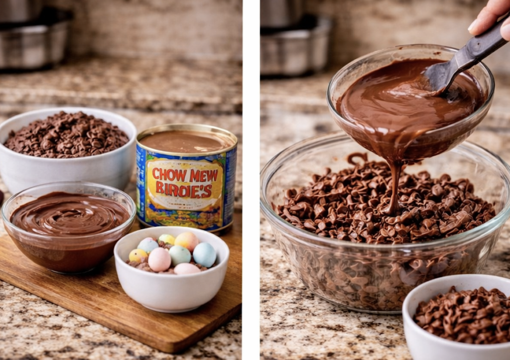 Chocolate cookie dough creates the soft base for the nests and pairs perfectly with the crunchy chocolate topping. Chocolate-coated chow mein noodles give the cookies their signature nest look and texture. Melted chocolate helps hold the nests together, while pastel candy eggs make the final dessert festive and Easter-ready.