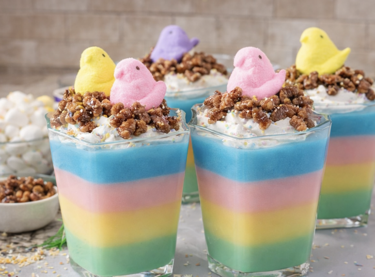 Using a variety of colorful Jell-O flavors gives these cups their bright layered Easter look. Sweetened condensed milk adds a creamy sweetness that pairs beautifully with the fruity gelatin. Whipped topping makes the final dessert extra soft and festive, while Cadbury Mini Eggs and pastel sprinkles give the perfect Easter finishing touch.