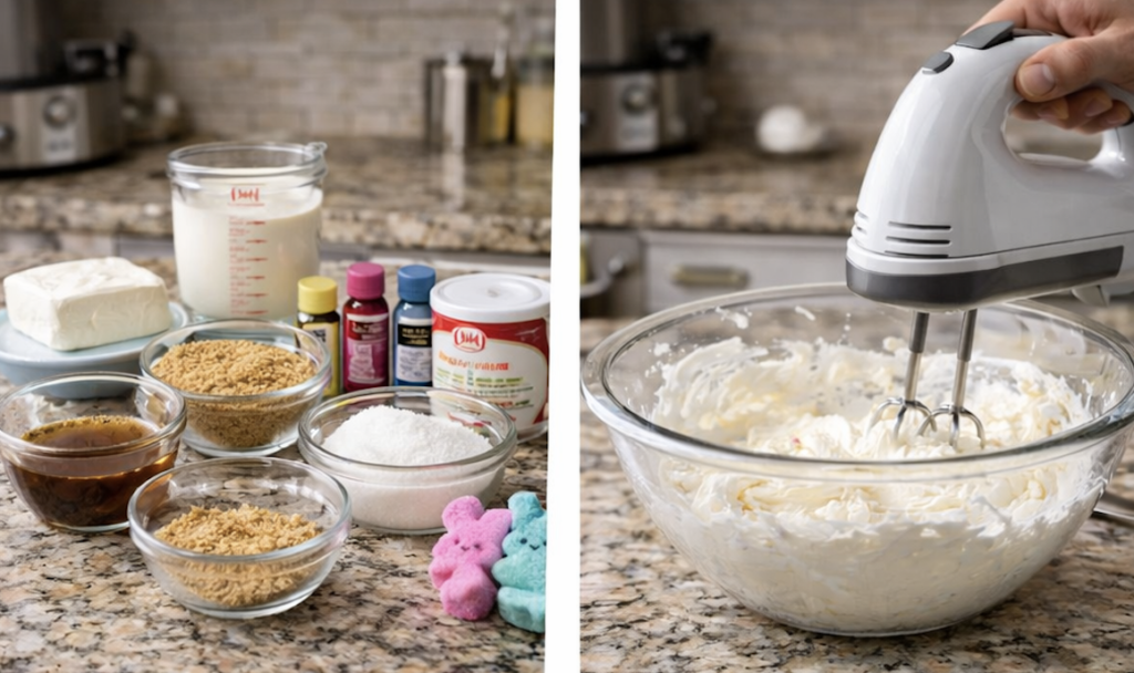 Softened cream cheese is important for a smooth mousse without lumps. Heavy whipping cream helps create the light and airy texture that makes this dessert so special. Graham cracker crumbs bring that classic cheesecake crust flavor, while marshmallow bunnies and pastel sprinkles make the jars extra festive for Easter.