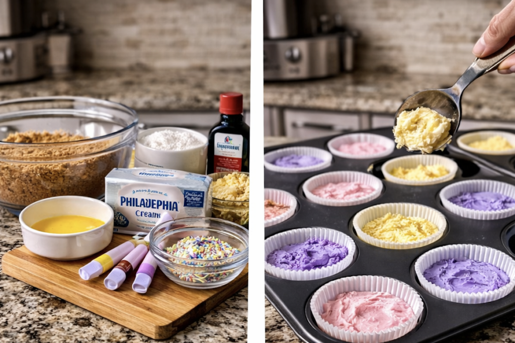 What makes these mini cheesecakes so special is their cheerful pastel filling. The creamy cheesecake mixture is divided and tinted in soft pink, yellow, and purple shades, giving each cheesecake a bright Easter look that is perfect for dessert tables, brunches, spring parties, or family gatherings. The graham cracker crust adds a buttery crunch that pairs beautifully with the soft and fluffy filling.