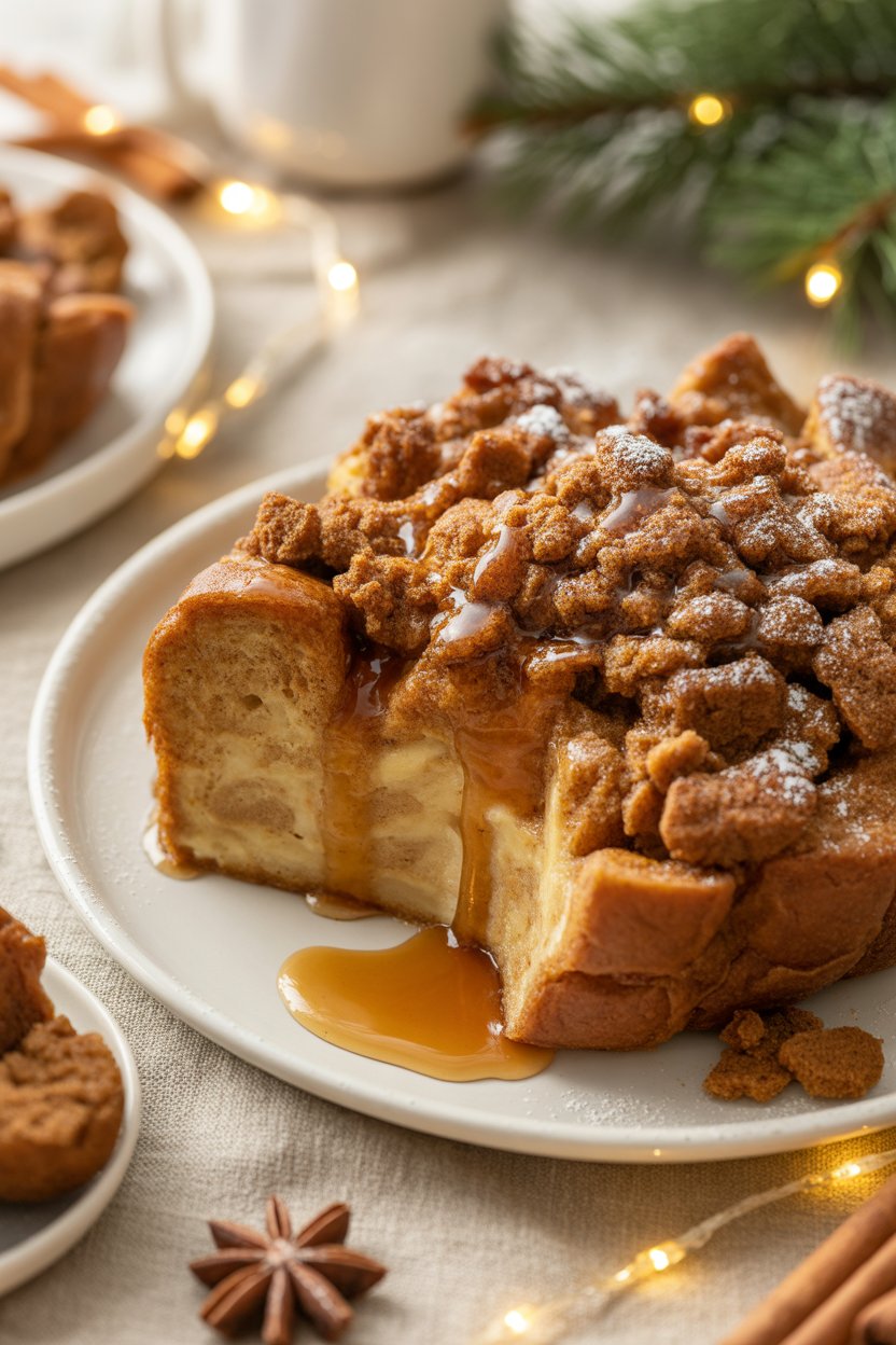 Soft on the inside, slightly crisp on top, and drizzled with maple syrup or vanilla icing, this casserole tastes like gingerbread cookies and French toast had a delicious Christmas baby.