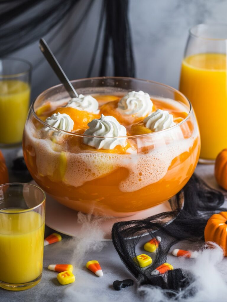 Scoop orange sherbet into large spoonfuls and drop them into the punch. They’ll float on top and slowly melt, creating a foamy, creamy swirl effect that looks like a spooky potion.