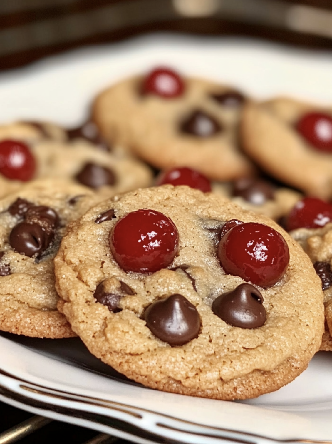 They’re thick, chewy, buttery, and studded with juicy maraschino cherries that add bursts of sweetness in every bite. The cherry flavor blends beautifully with rich chocolate chips, creating a cookie that tastes like a chocolate-covered cherry — but in warm, cozy cookie form.