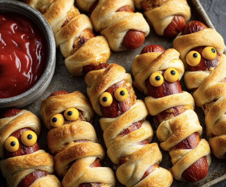 Think of them as a fun Halloween makeover for the classic pigs in a blanket: juicy hot dogs wrapped in buttery crescent dough “bandages,” baked until golden, then finished with tiny mustard eyes that peek out like little mummies ready to haunt your snack table.