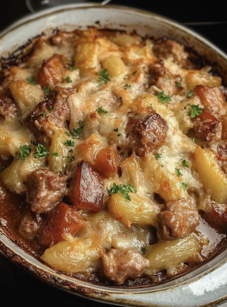 Creamy Polish Casserole with kielbasa, egg noodles, and melted cheese in a baking dish