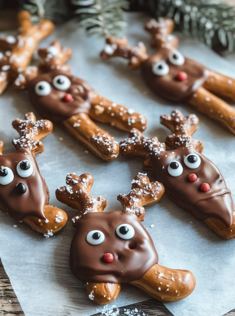 Reindeer Pretzel Treats made with chocolate, pretzels, candy eyes, and red M&M noses