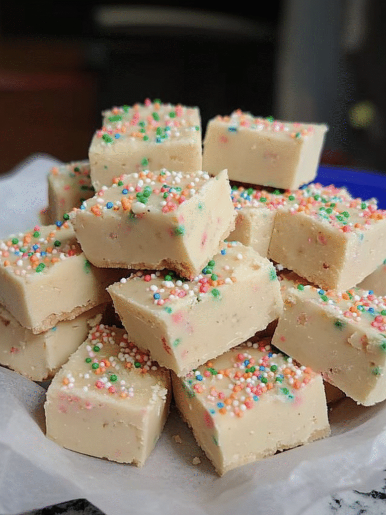 Creamy sugar cookie fudge with holiday sprinkles cut into squares