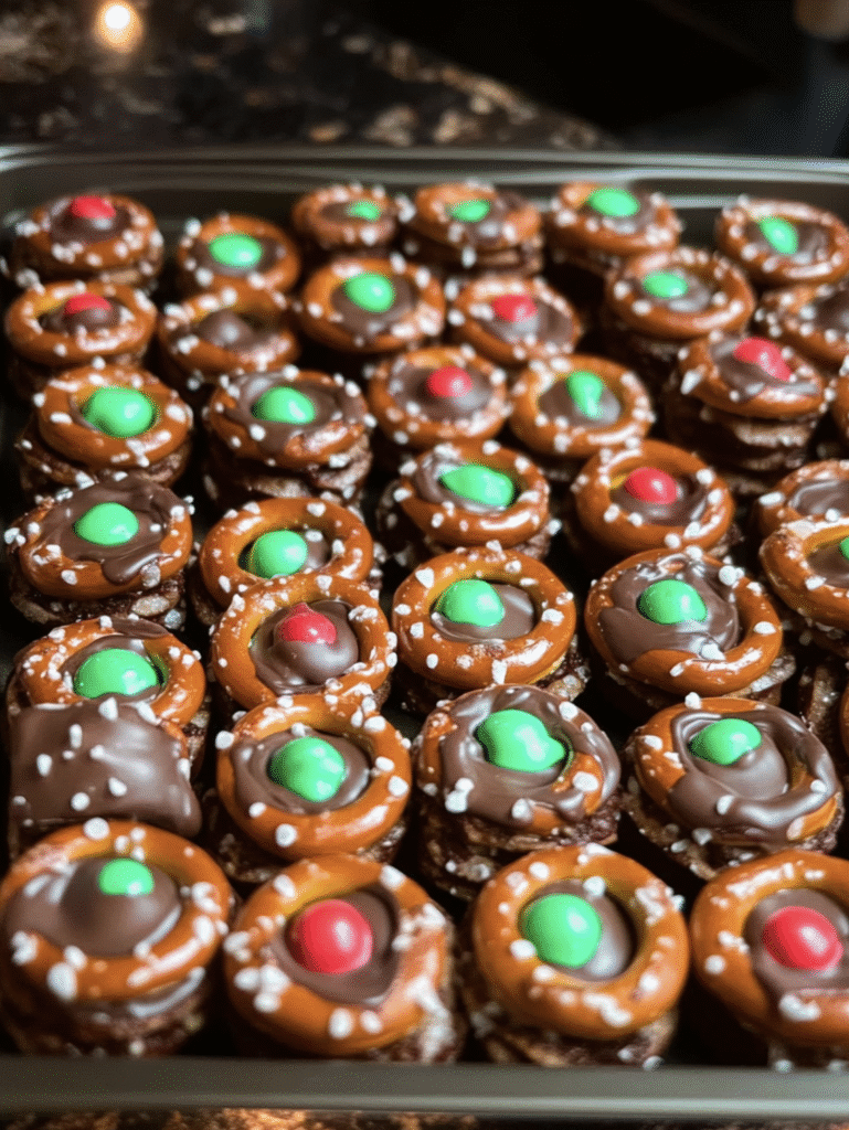 Holiday Pretzel Delights with chocolate and festive M&M toppings