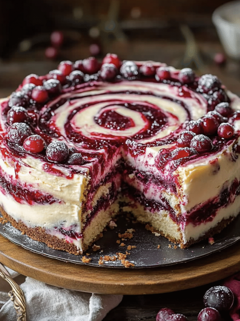 Festive Cranberry Sauce Swirl Cake loaf with powdered sugar glaze