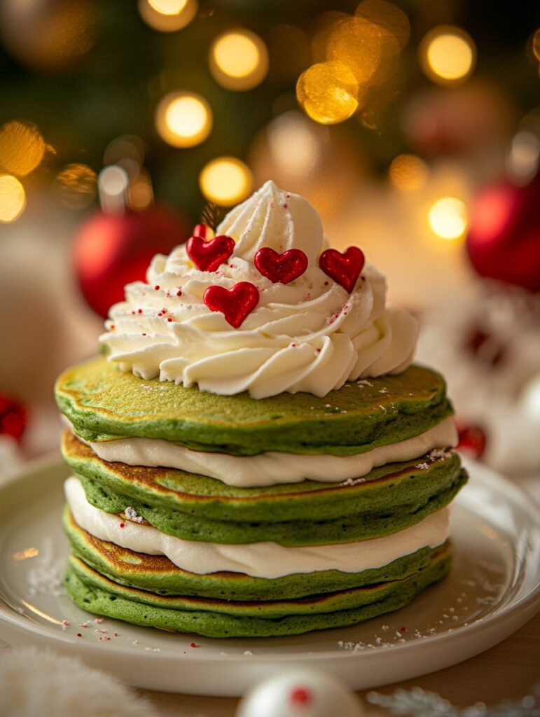 Stack of green Grinch pancakes with whipped cream and a red heart on top