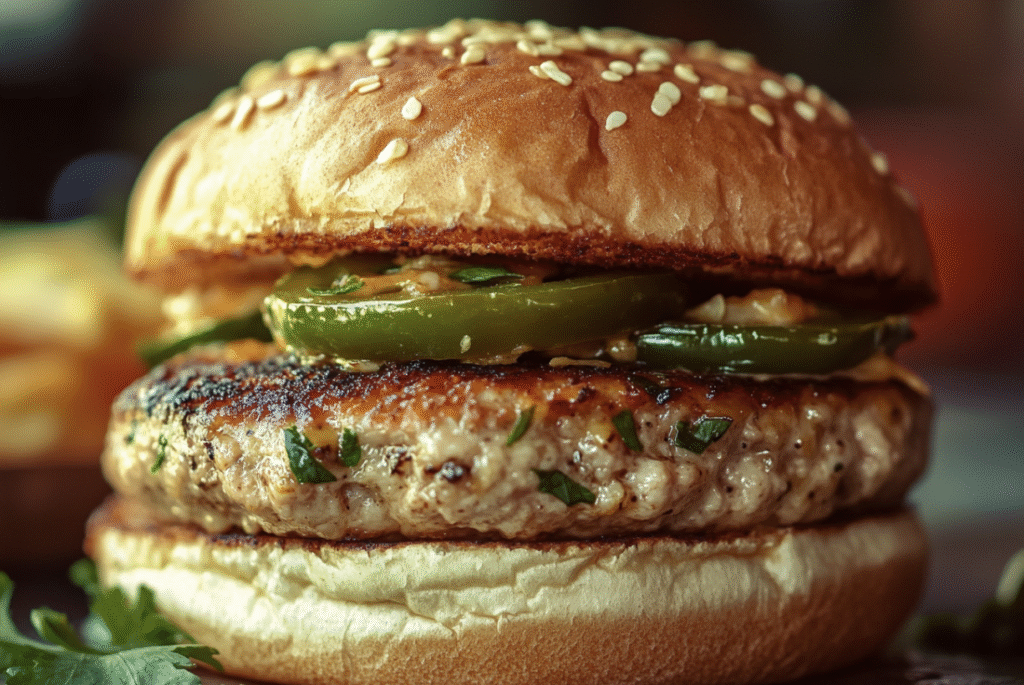 Juicy jalapeño popper turkey burger with melted cheese on toasted bun