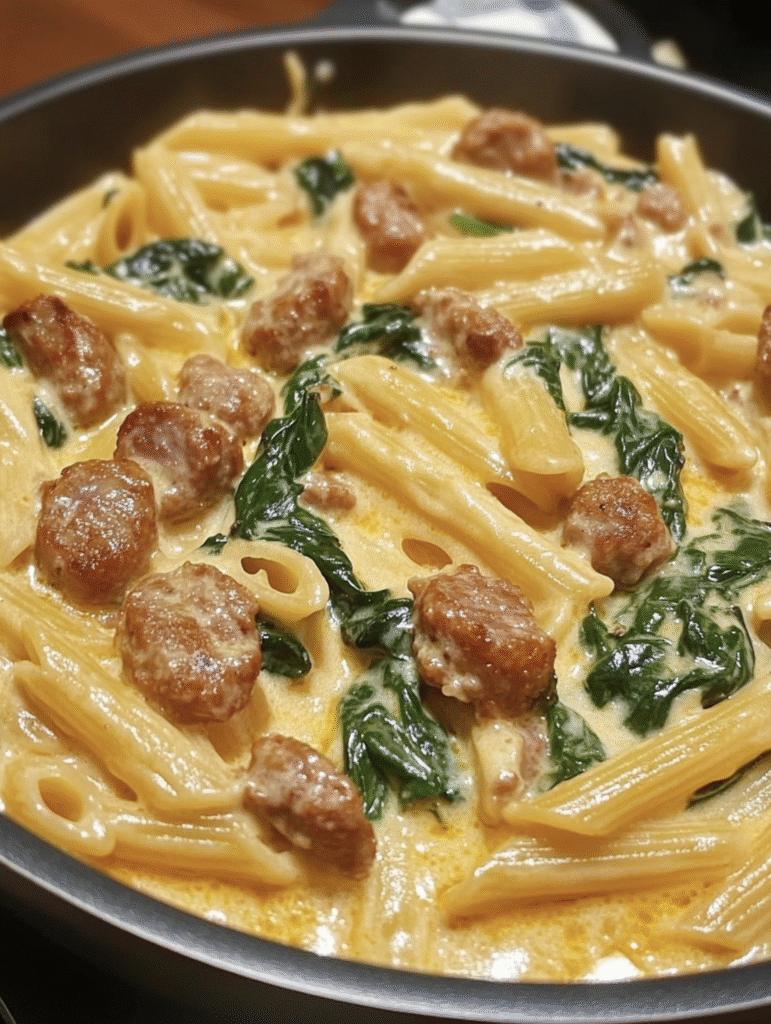 Creamy penne pasta with spinach and Italian sausage in one pan