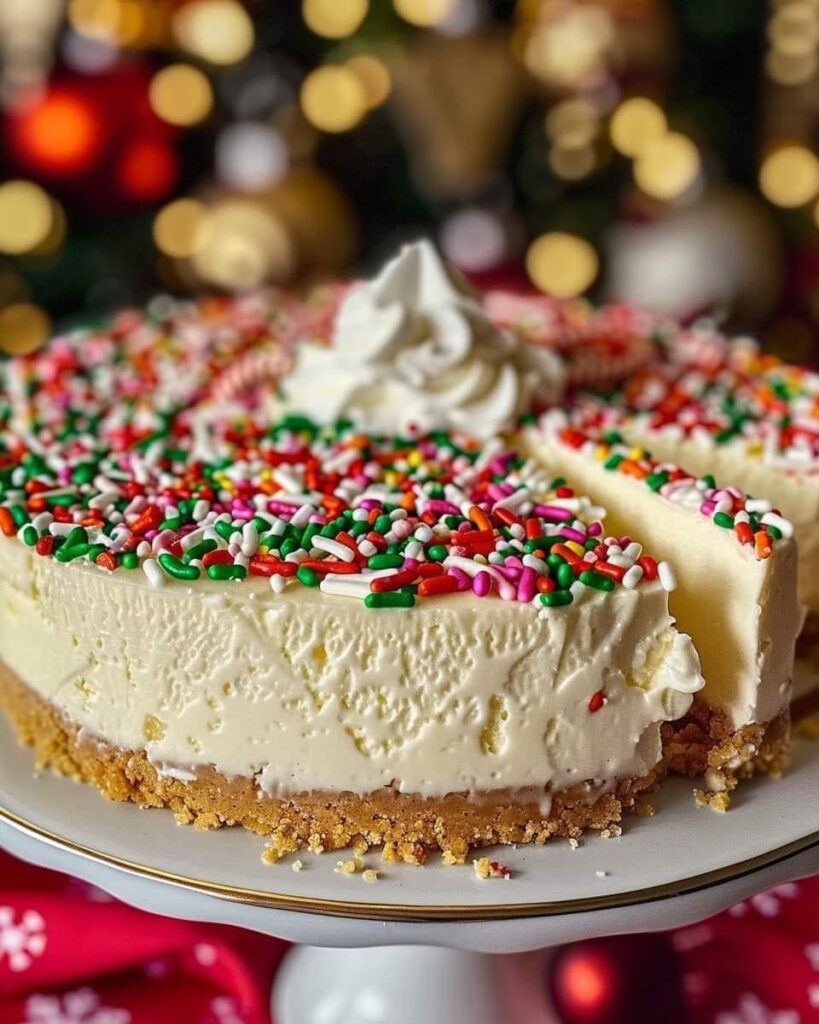 Christmas sugar cookie cheesecake with sprinkles and whipped cream