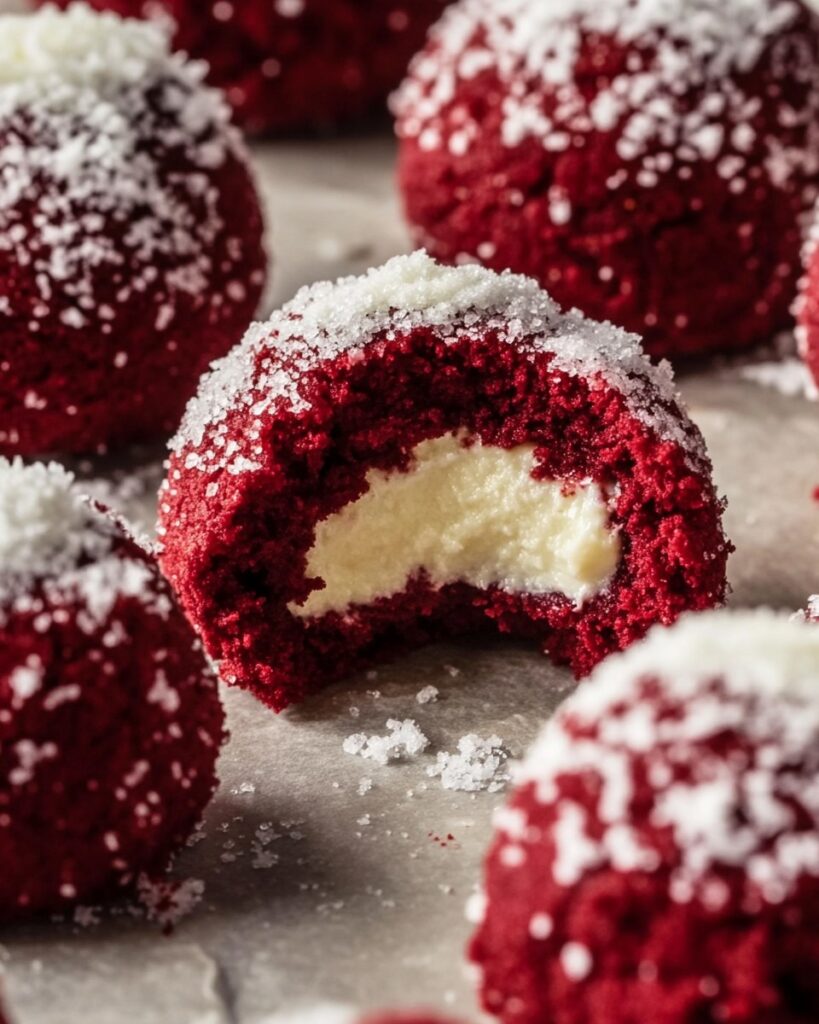 Red velvet snowball cookies with white chocolate filling coated in powdered sugar
