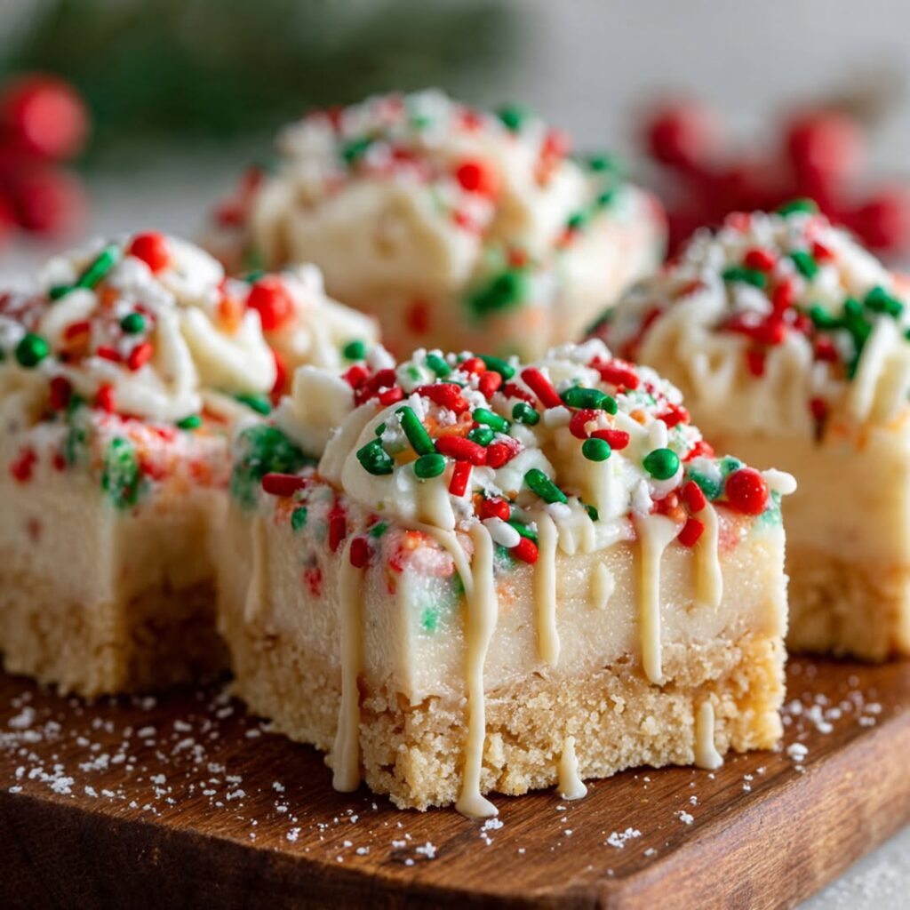No-bake Christmas sugar cookie cheesecake bars with sprinkles
