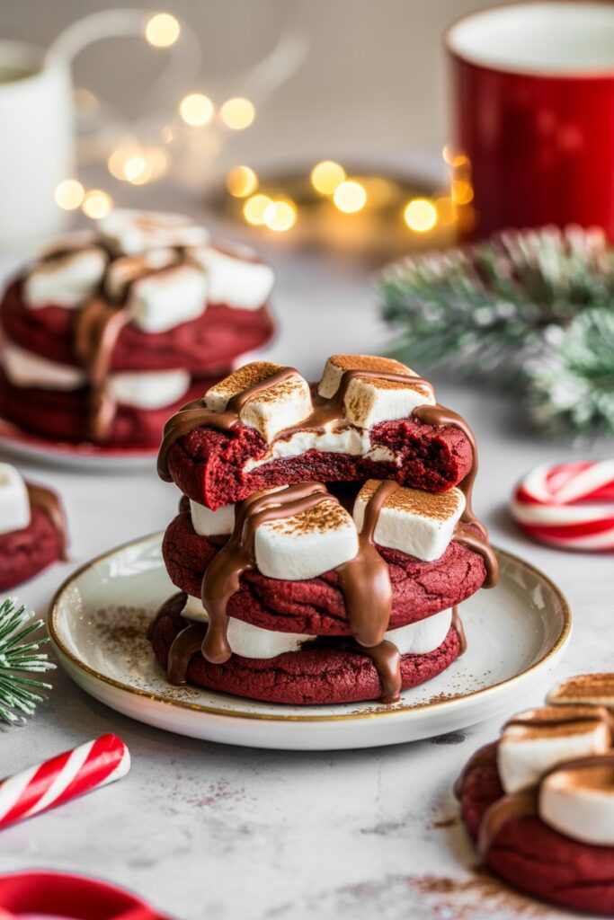 Red velvet hot cocoa cookies with melted marshmallows on top