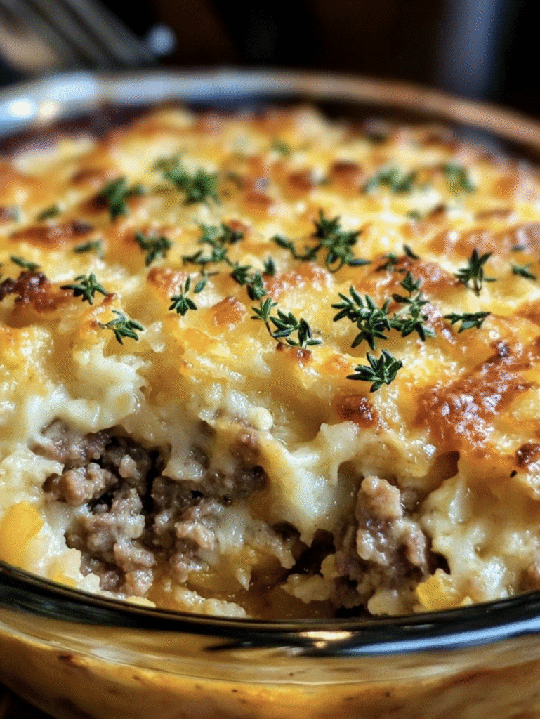 Cheesy sausage and hashbrown breakfast casserole in baking dish