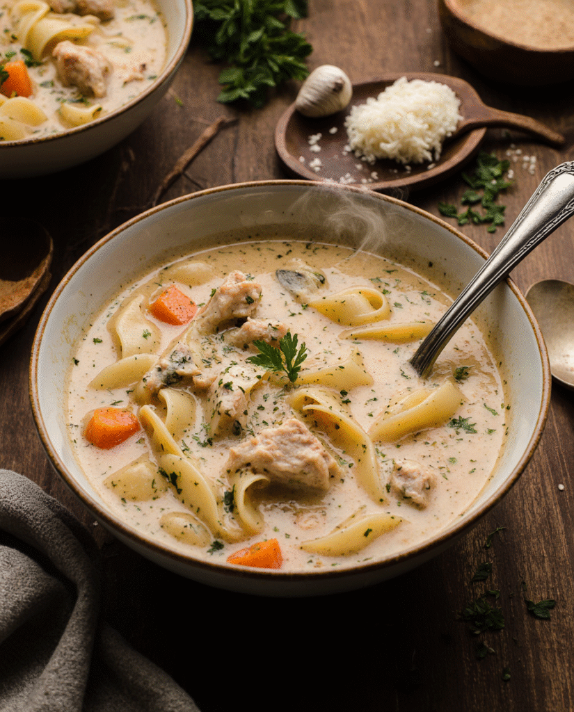 Creamy Garlic Parmesan Chicken Noodle Soup | Cozy, Comforting Dinner