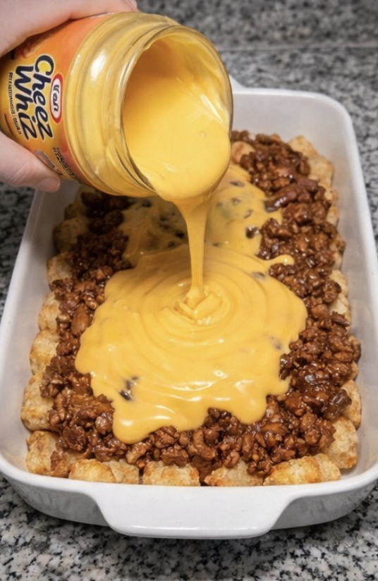 Spoon the sloppy joe beef mixture over the tater tots.