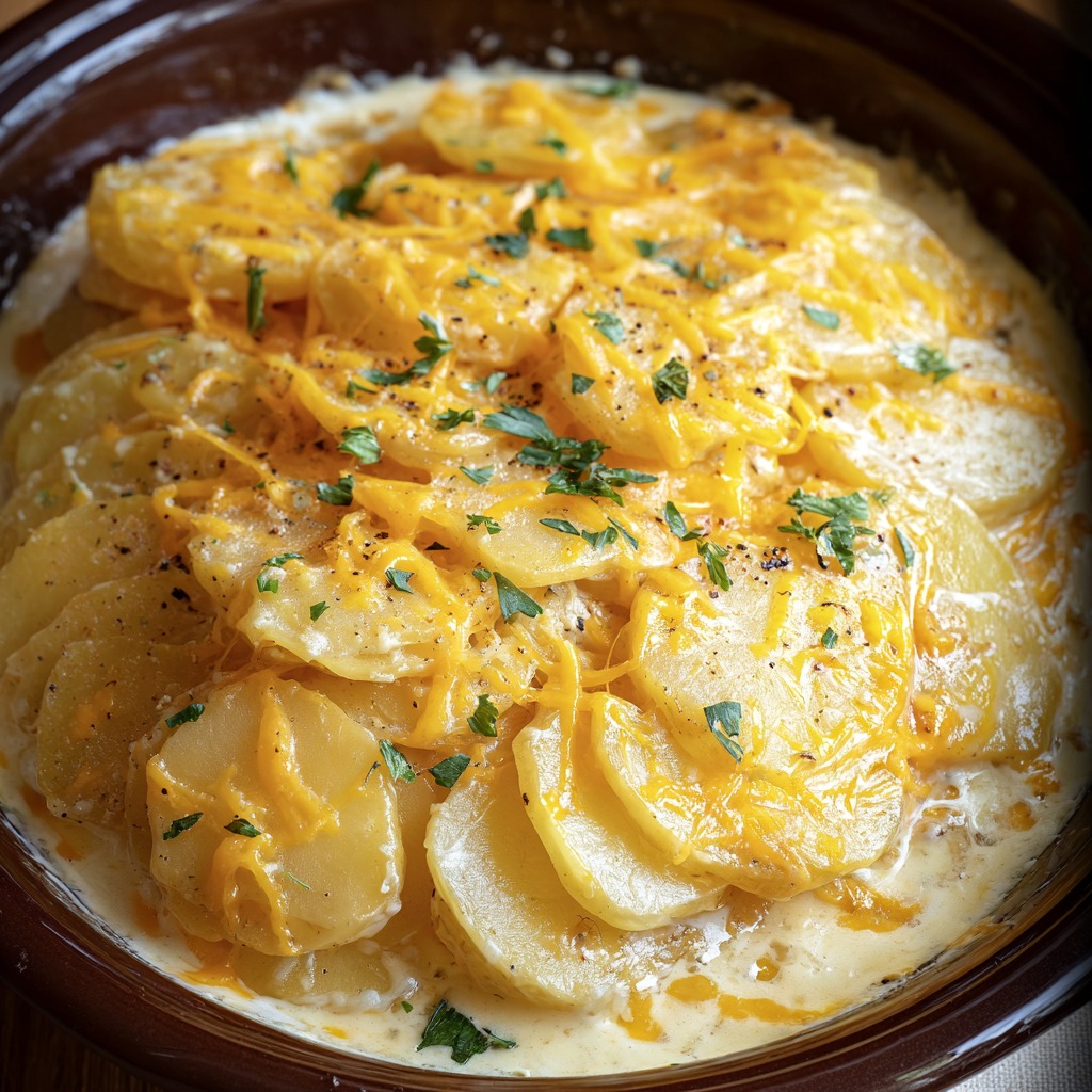 Traditional scalloped potatoes can be tricky — uneven cooking, burnt edges, or dried-out sauce. This slow cooker version eliminates all the guesswork. The gentle heat melts the cheese evenly, the cream coats every slice, and the potatoes stay soft without falling apart. It’s the easiest, most reliable way to get classic scalloped potatoes with zero stress.